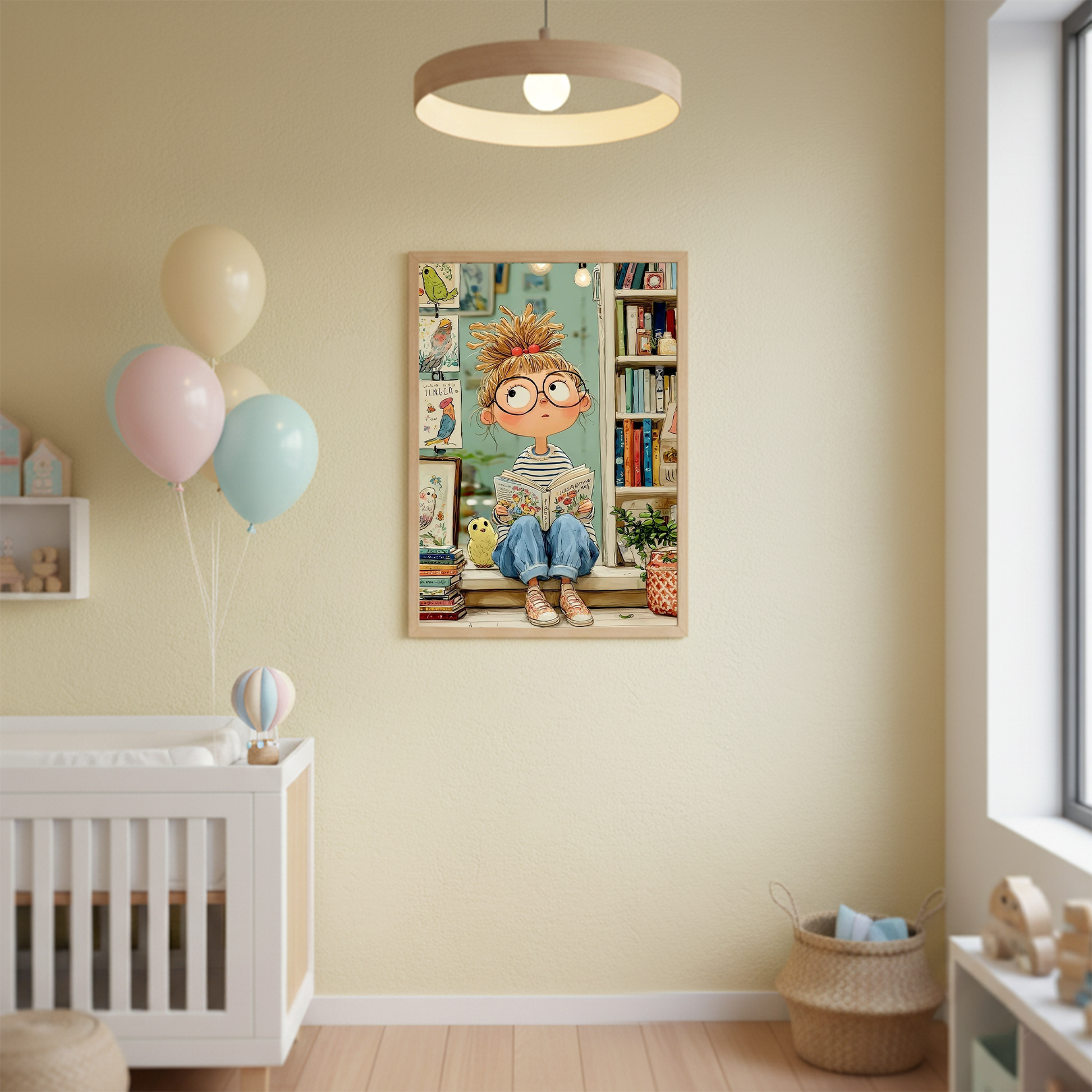 A delightful illustration of a curious girl with oversized glasses, sitting among books while reading a colorful story. Surrounded by cozy details and soft tones, this artwork captures the charm of imagination, learning, and childlike wonder. Perfect for creating a warm and playful atmosphere in any room.