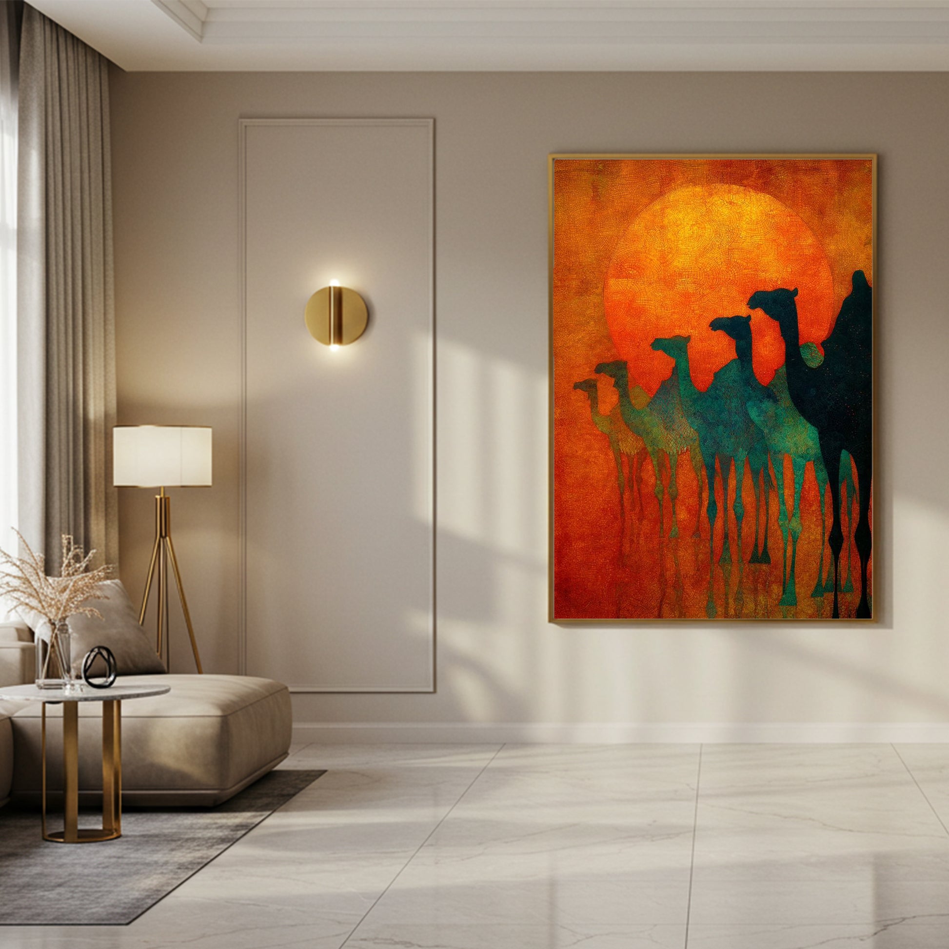 Caravan at Sunset captures the timeless rhythm of desert life — a procession of camels silhouetted against a blazing orange sun. The deep contrast between warm sands and cool teal shadows evokes the vastness and mystery of the desert.