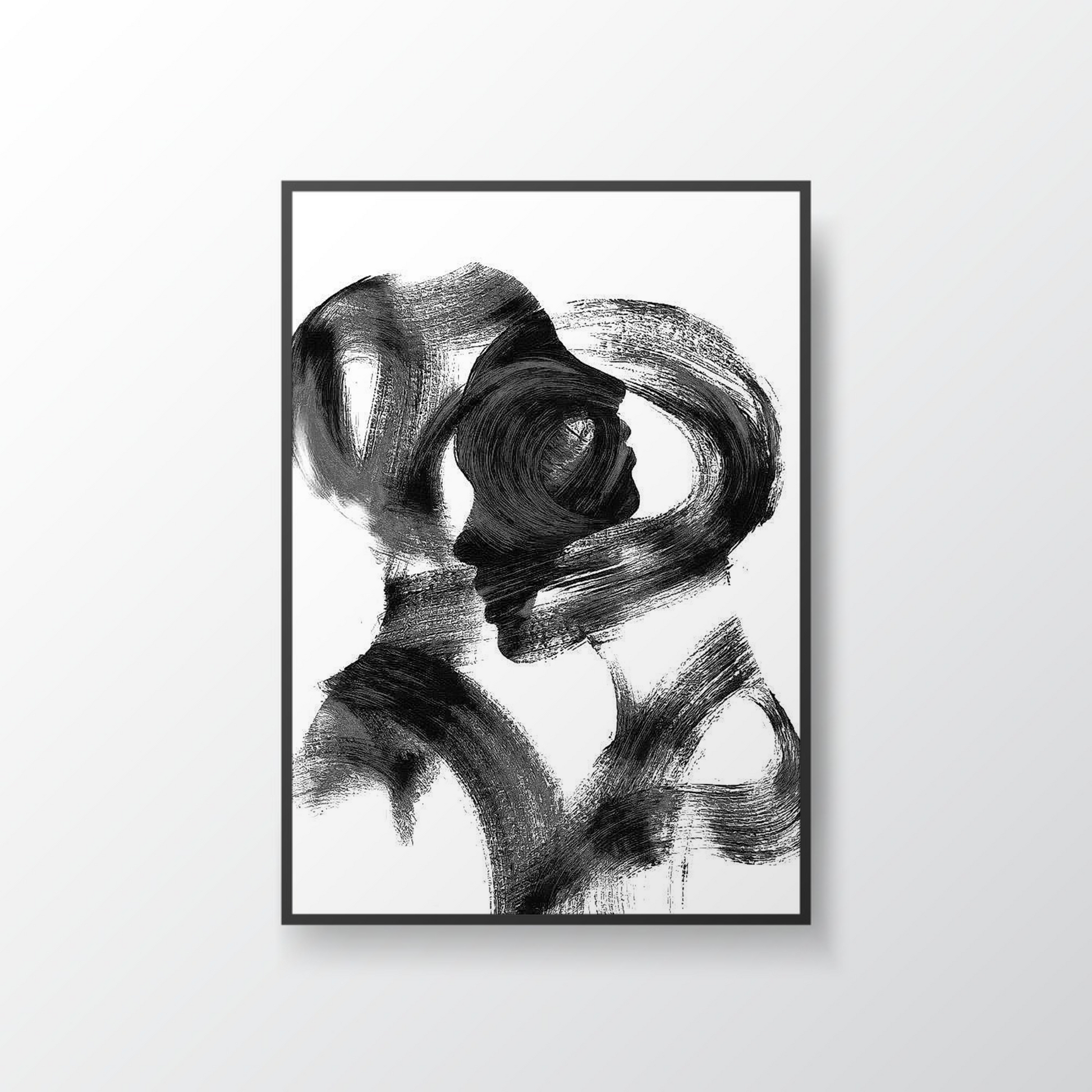 A minimalist black and white abstract artwork featuring bold, sweeping brushstrokes that intertwine to reveal the subtle outline of two human profiles. The piece symbolizes connection, duality, and the harmony between individuality and togetherness. Its raw, textured strokes evoke emotion while maintaining a modern, sophisticated aesthetic — perfect for contemporary interiors.