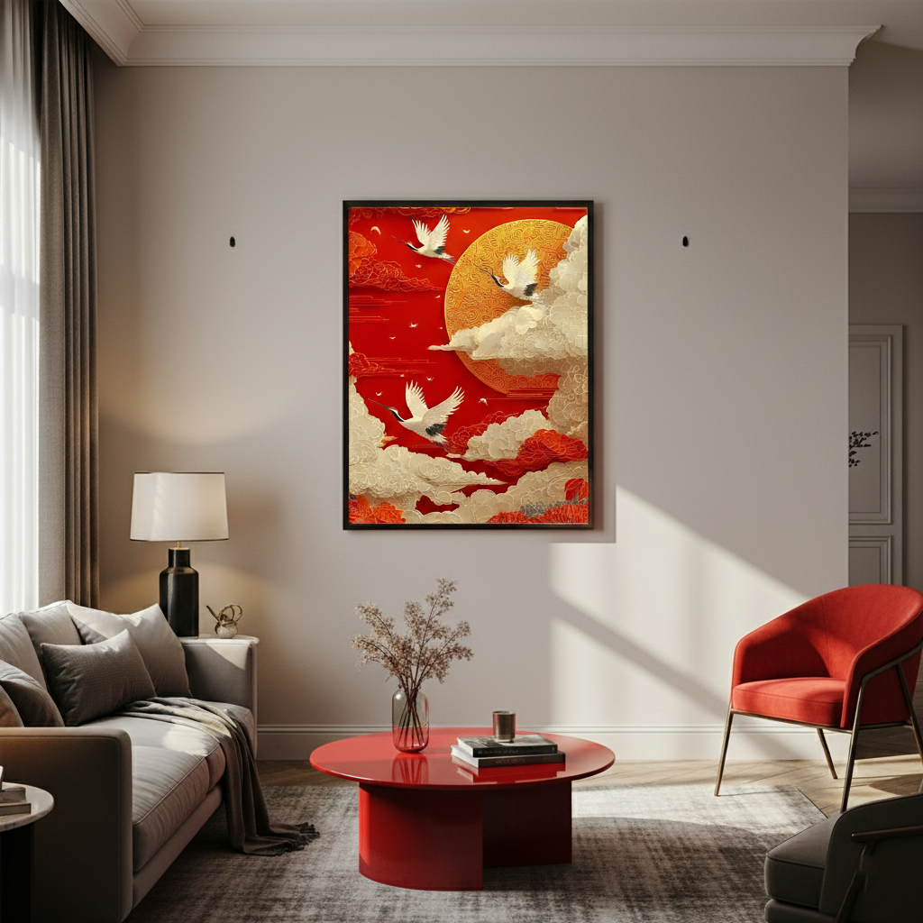 A mesmerizing dance of cranes soaring through golden clouds beneath a radiant sun. Eternal Flight symbolizes freedom, hope, and the endless pursuit of light. The vivid red and gold hues evoke passion and vitality, capturing the spirit of balance between earth and sky — strength and serenity intertwined.