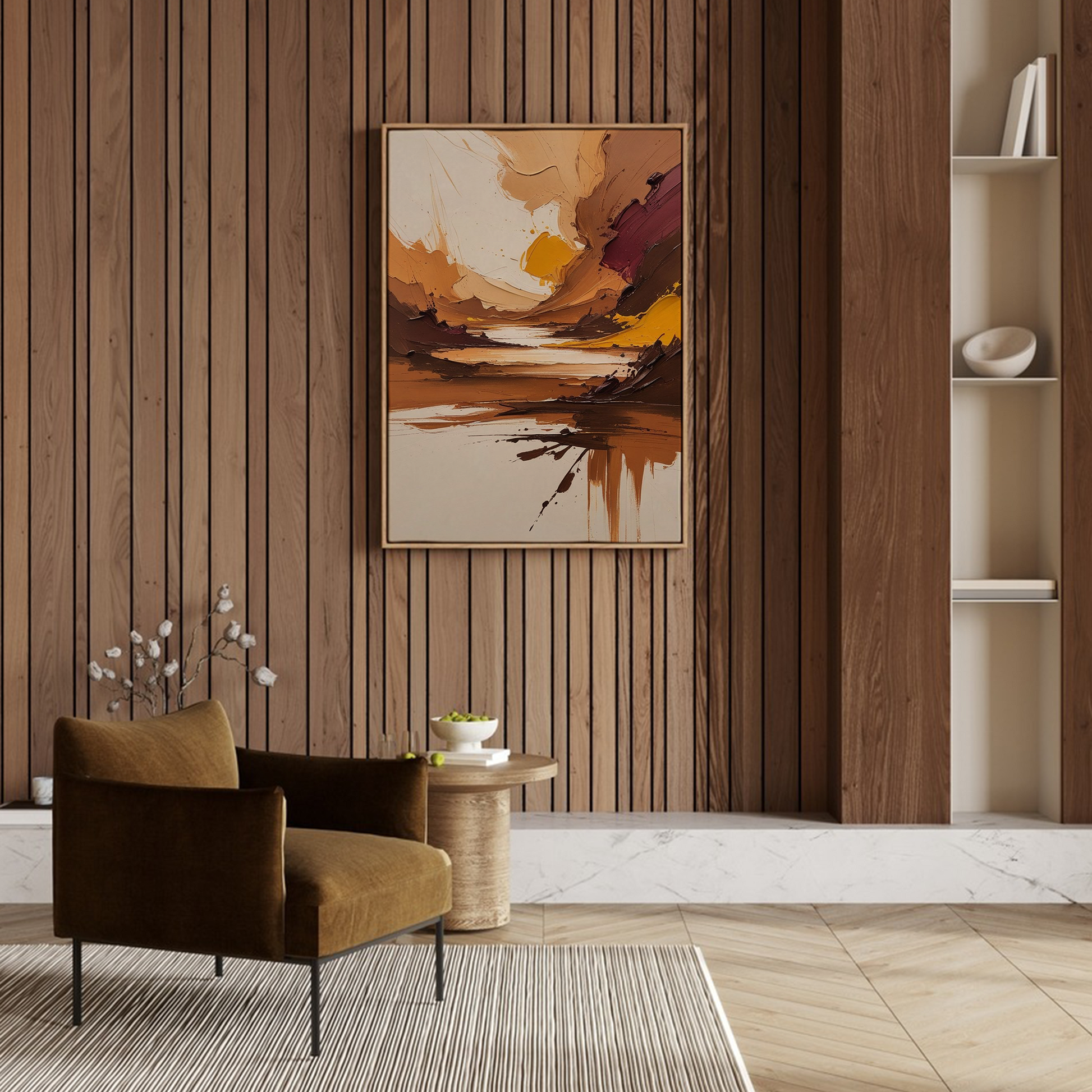 This abstract painting uses warm tones of brown, gold, and maroon to express the beauty of a sunset over a quiet landscape. The bold, sweeping strokes suggest movement and emotion, symbolizing the end of a journey or the hope of a new beginning. It invites the viewer to feel calm, inspired, and connected to nature.