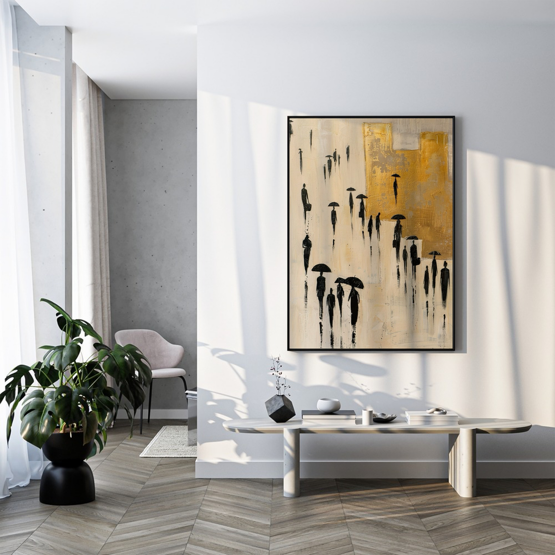 This painting shows people walking in the rain with umbrellas. The golden background represents hope and light in everyday life. Even when it rains, there is beauty and movement in the crowd.