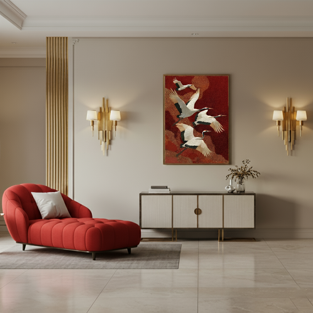 Graceful Flight portrays a flock of cranes gliding effortlessly through a crimson sky, symbolizing longevity, peace, and transcendence. The rich red background, detailed with golden textures, evokes a sense of timeless elegance and spiritual harmony.