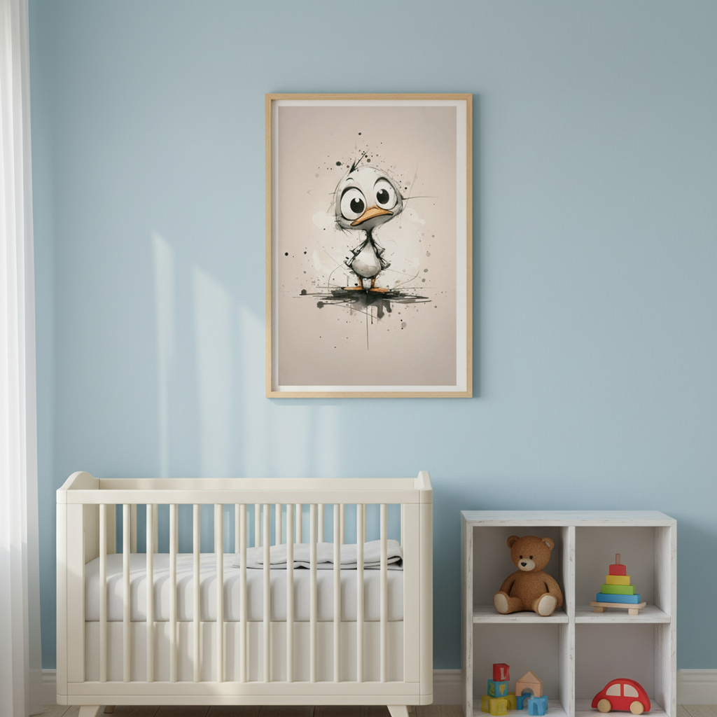 A whimsical art print of a tiny duck with oversized eyes and playful details. The expressive design, with its modern sketchy strokes and subtle splashes, brings a touch of humor and lightness to any room.