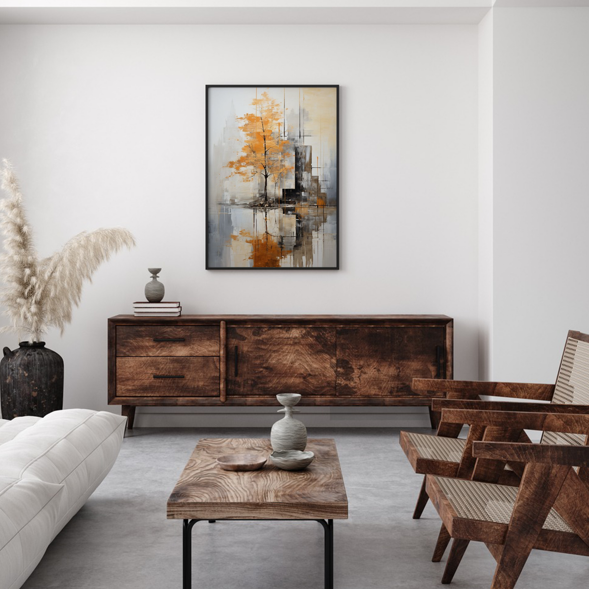This painting shows a bright orange tree in the middle of an abstract city. The tree is reflected in calm water below. It represents the balance between nature and modern life, and how beauty can be found even in busy, urban places.