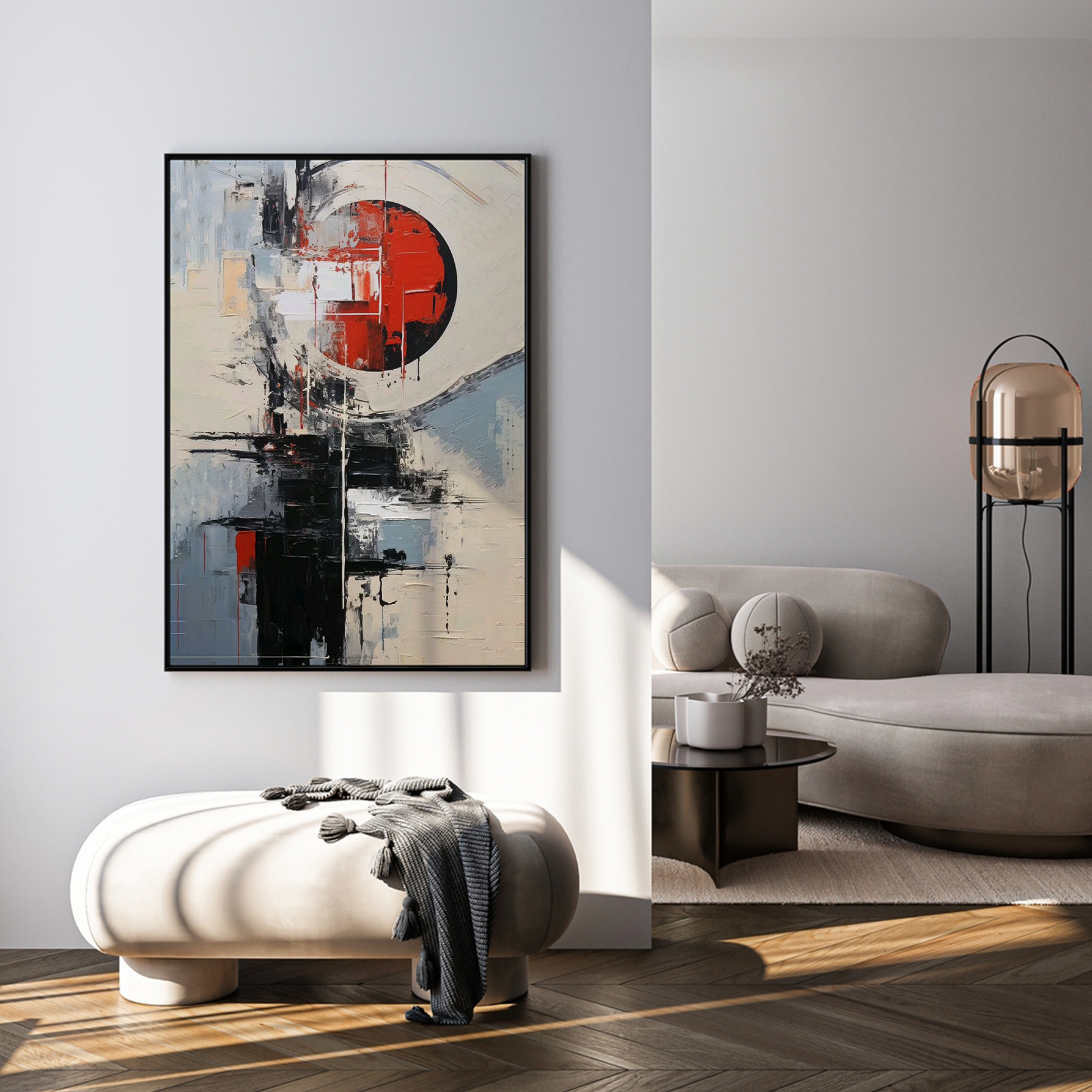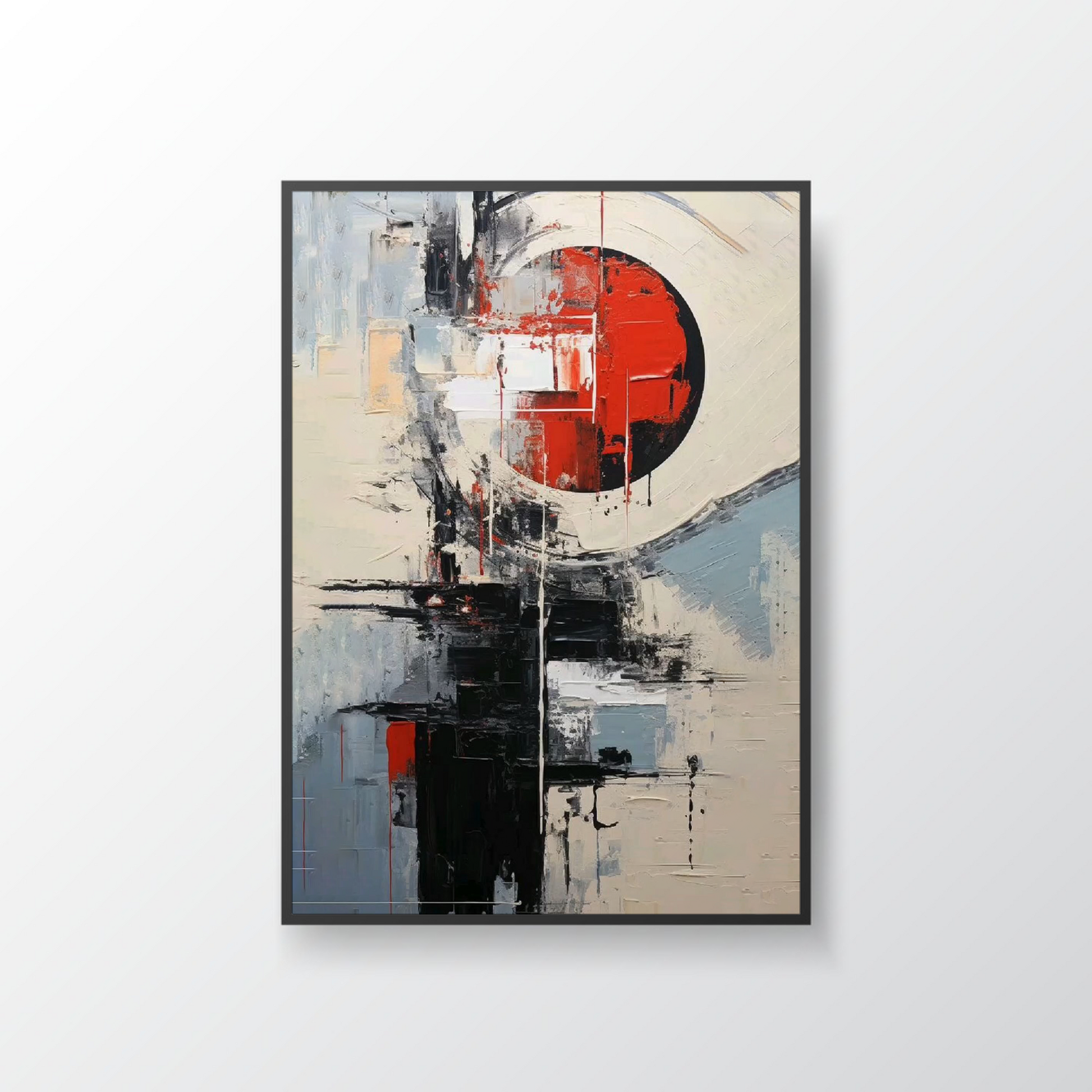 This abstract painting shows a strong red circle at the center, surrounded by blocks of black, white, and grey. It represents powerful energy or emotion rising from within — like a core of strength or passion pushing through confusion and chaos. The bold red circle stands for inner fire, while the surrounding shapes show life's challenges and structure.