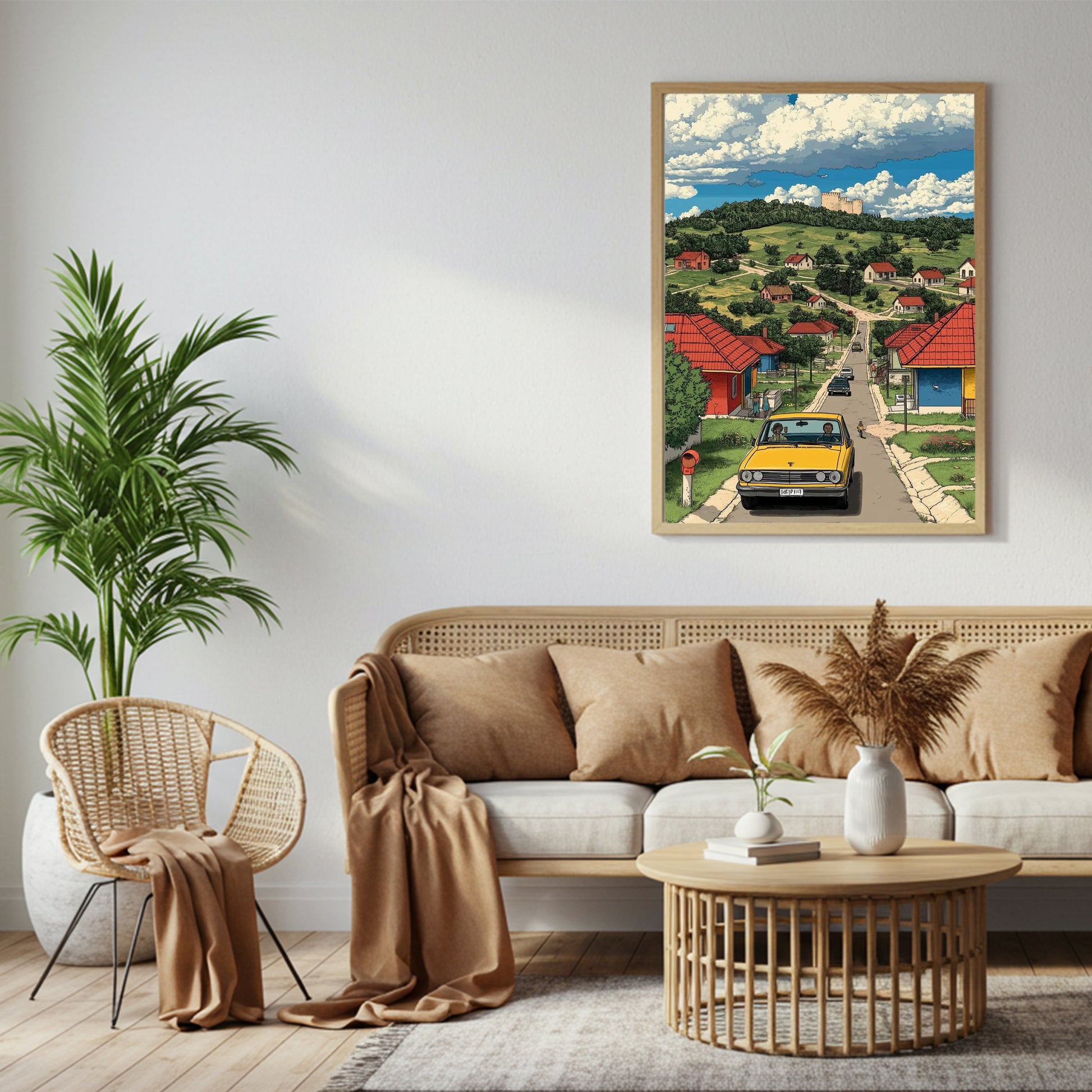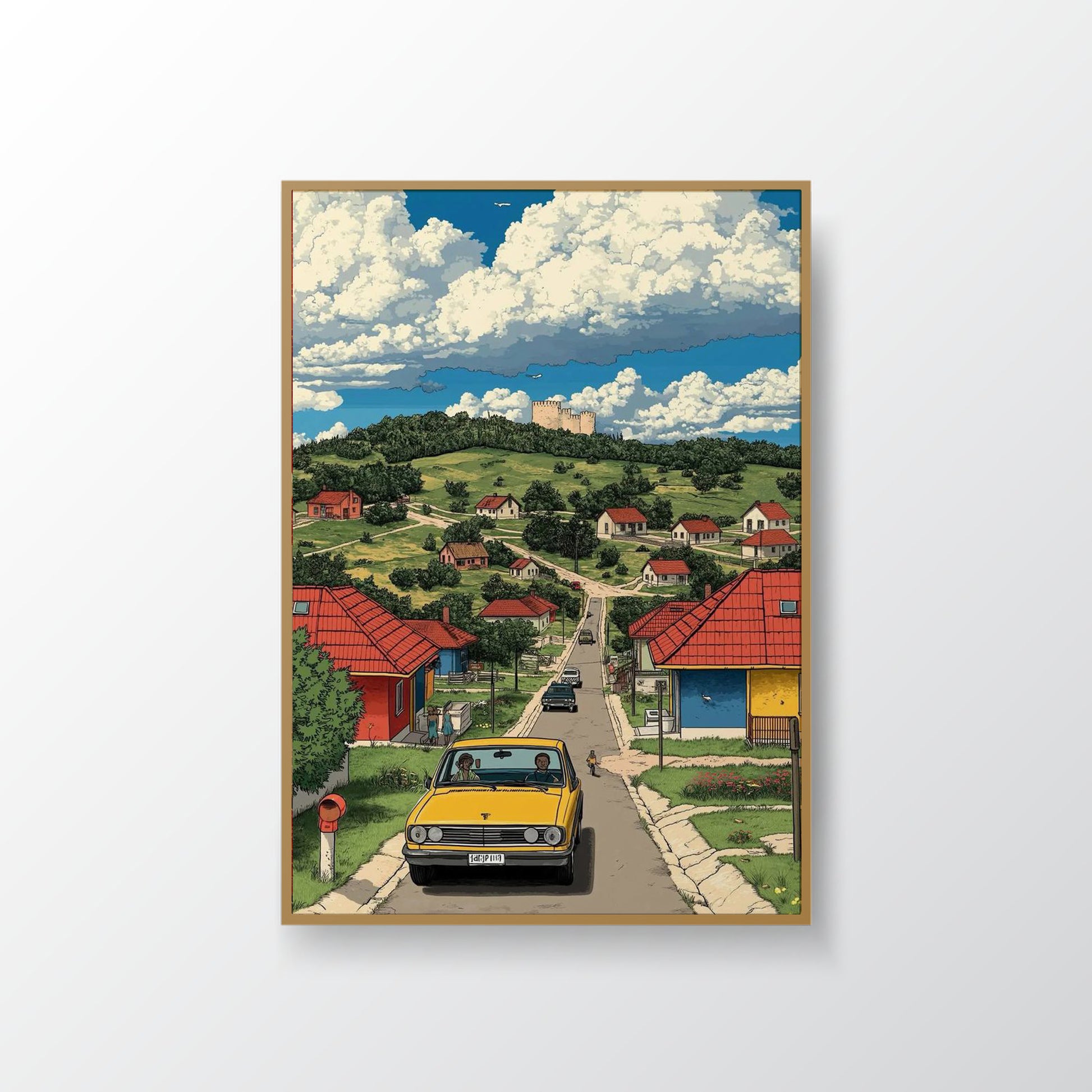 A nostalgic journey unfolds along a sunlit road leading through a peaceful countryside village. Road to the Castle captures the charm of simple days — red rooftops glowing under vast skies, rolling hills whispering with memories, and the promise of adventure just beyond the horizon. It’s a scene that celebrates freedom, warmth, and the quiet poetry of everyday life.