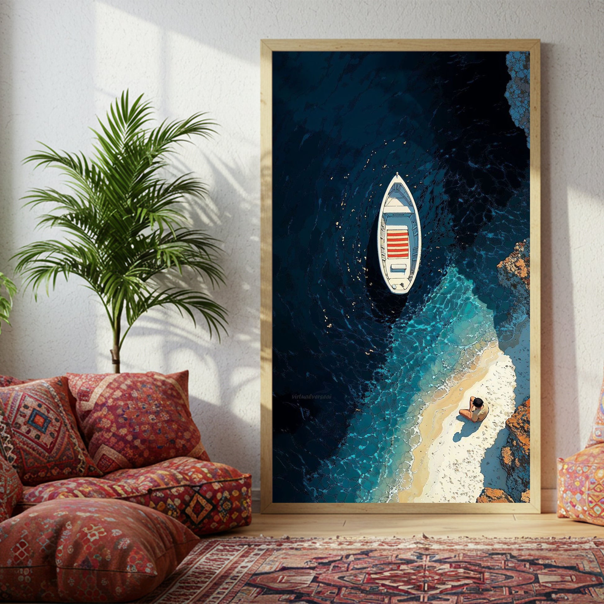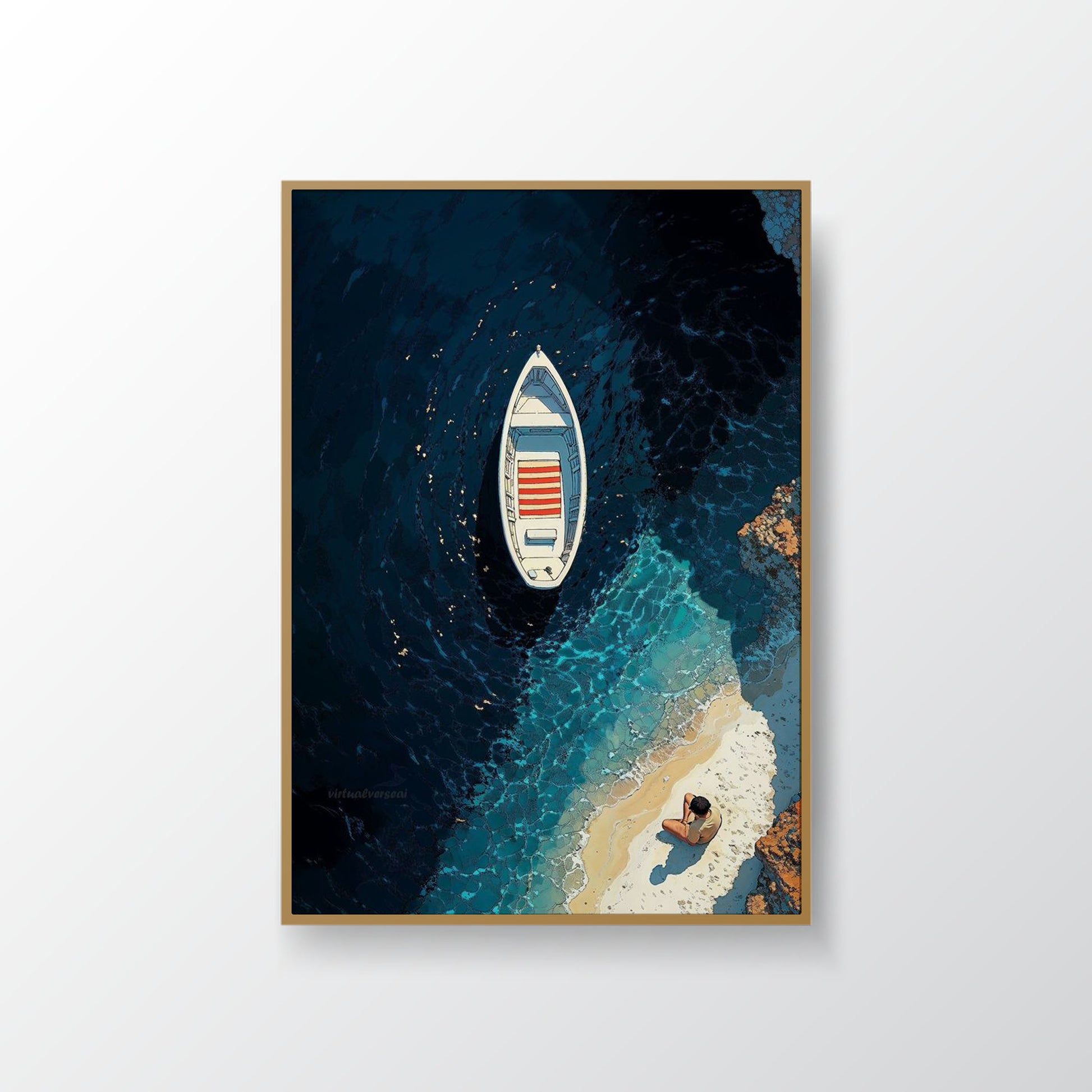 From a serene aerial view, Silent Tide captures the poetic stillness between sea and shore. A lone boat drifts over deep sapphire waters, while a solitary figure sits quietly on the sunlit sand — a perfect harmony of solitude and peace. The subtle contrast of light and shadow invites reflection, evoking the beauty of quiet moments by the sea.