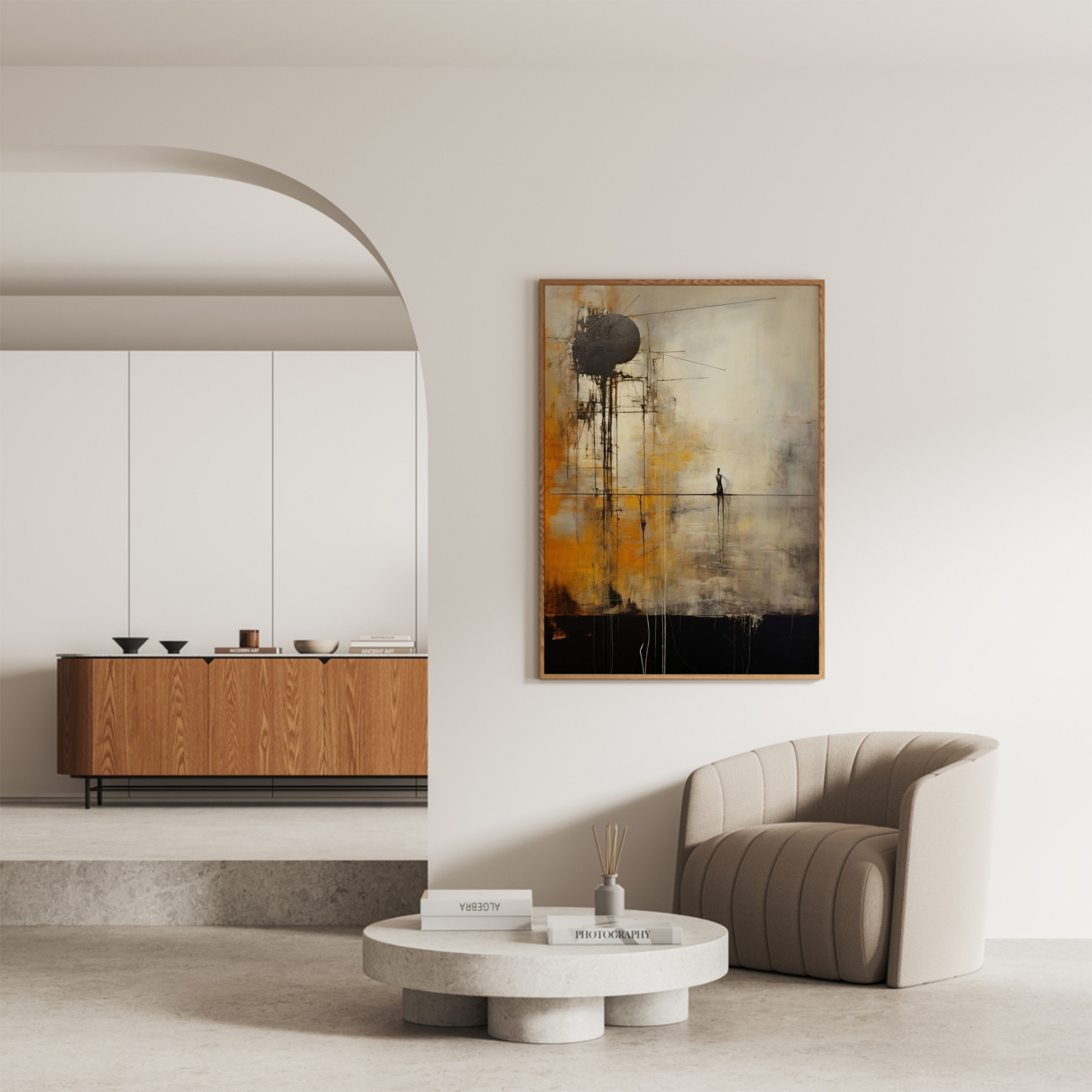 This abstract painting shows a lone figure standing on a thin line, symbolizing isolation, balance, or the journey of life. The dark sun and dripping lines may represent heavy thoughts or emotional struggles, while the warm background adds a sense of hope or reflection.
