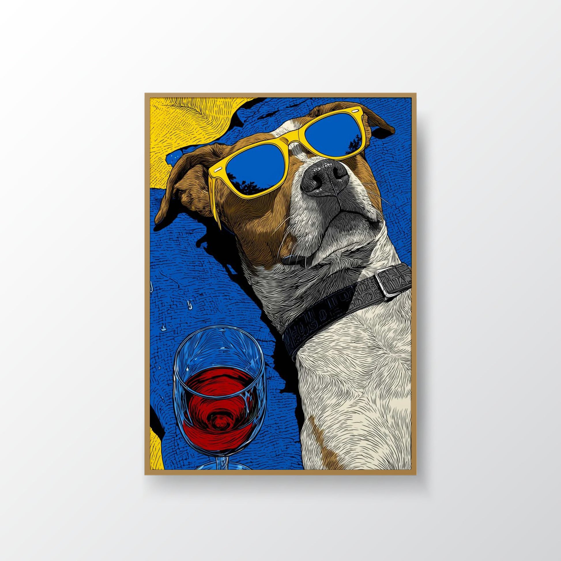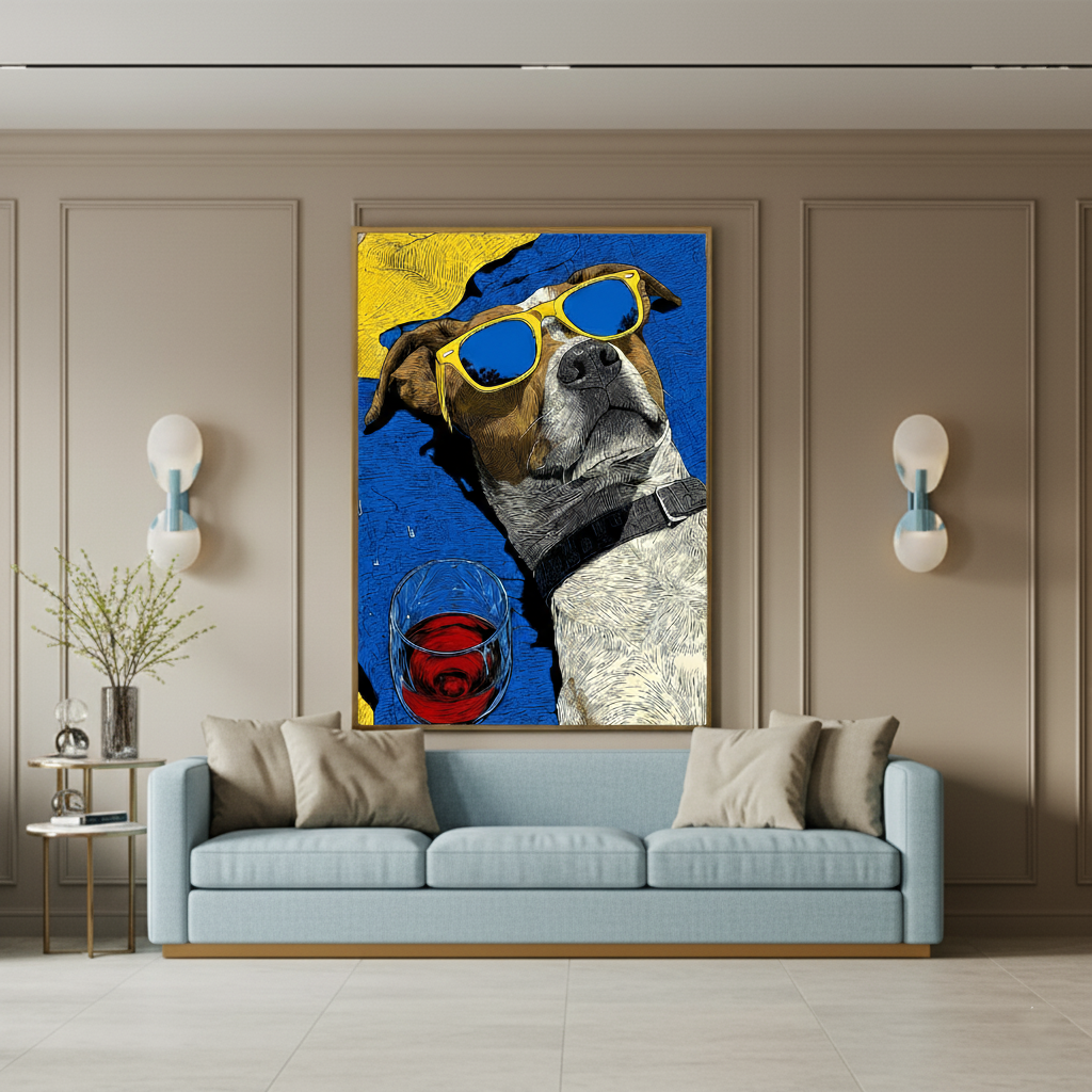 Summer Vibes captures the carefree spirit of sunshine and relaxation. A cool dog lounges with style — yellow sunglasses on, soaking in the warmth, with a glass of red wine by its side. The bold contrast of blue and yellow creates a fun, playful energy that radiates joy and confidence.