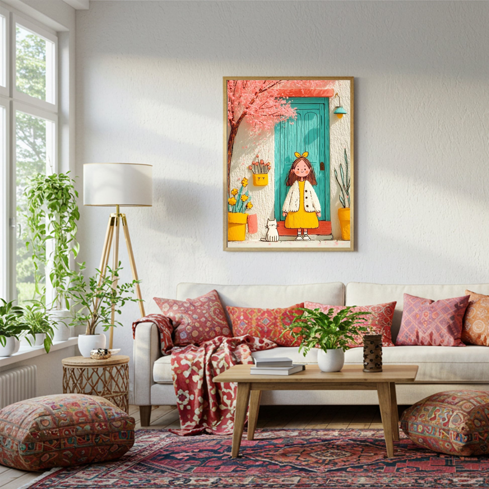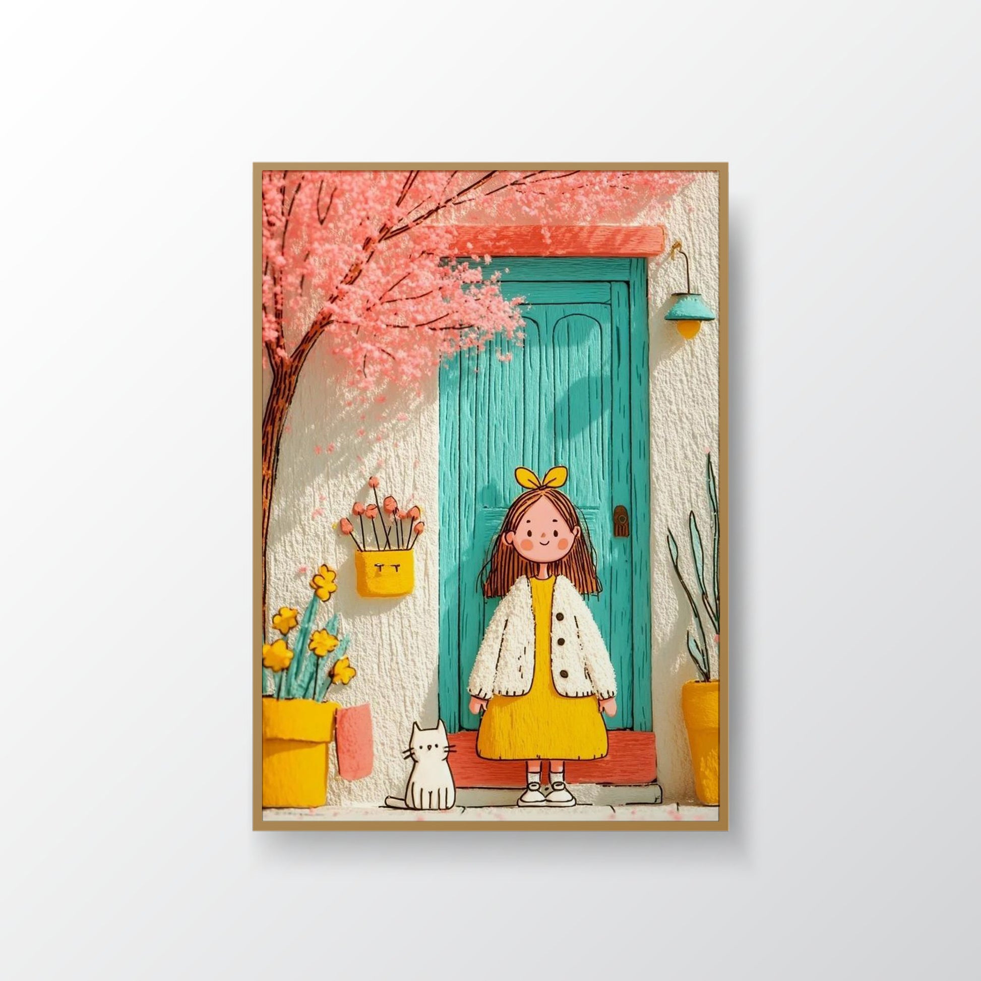 Bright and full of charm, Sunny Doorstep captures a sweet moment of innocence and joy. A cheerful girl and her cat stand before a turquoise door framed by blooming pink blossoms and vibrant pots of flowers. The playful colors and gentle details create a heartwarming sense of home, happiness, and sunshine.