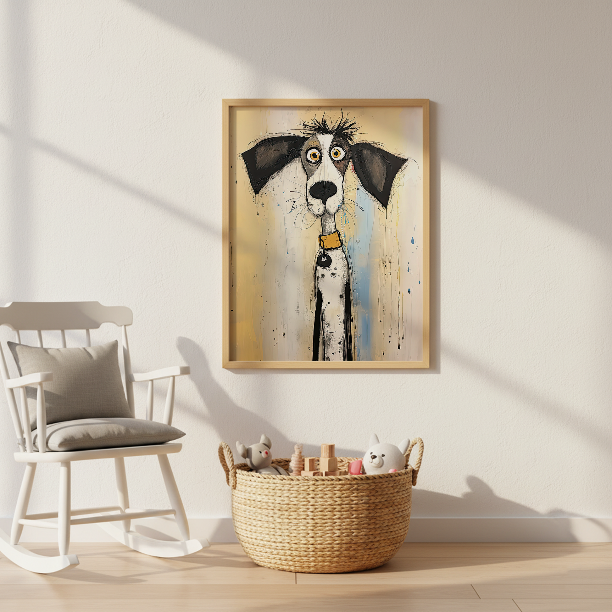 This charmingly awkward pup steals the spotlight with his long neck, oversized ears, and wide, confused eyes. Painted in a whimsical, illustrative style, the dog stands tall yet unsure — a perfect blend of innocence and eccentricity. The soft background with splashes of color adds to the playful, light-hearted vibe of the piece, making it ideal for modern, character-filled interiors.