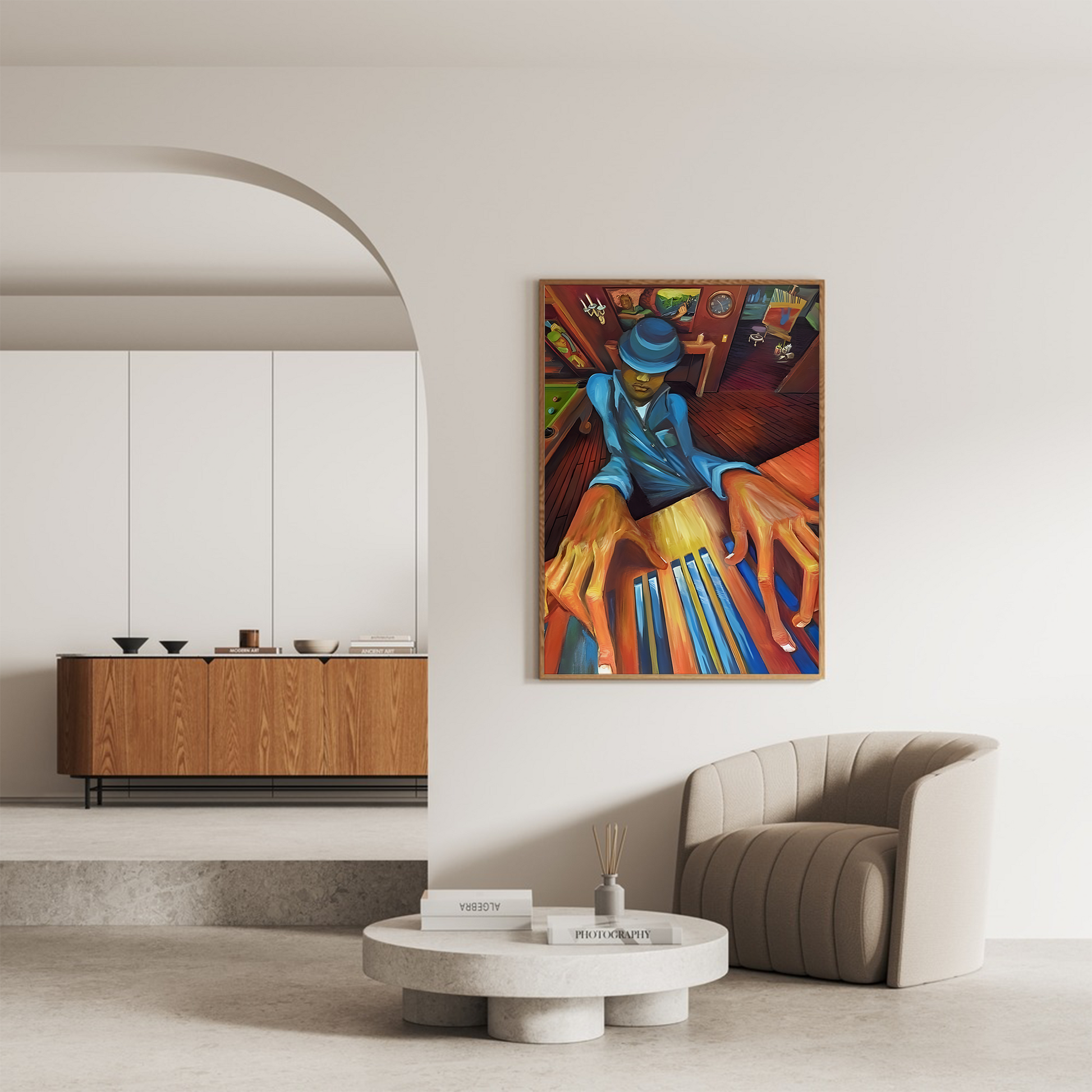 This painting shows a jazz musician deeply focused on playing the piano. The large hands and colorful keys show the energy and emotion of jazz music. The tilted angle and warm colors create a feeling of rhythm and movement, showing how music fills the room and the soul.