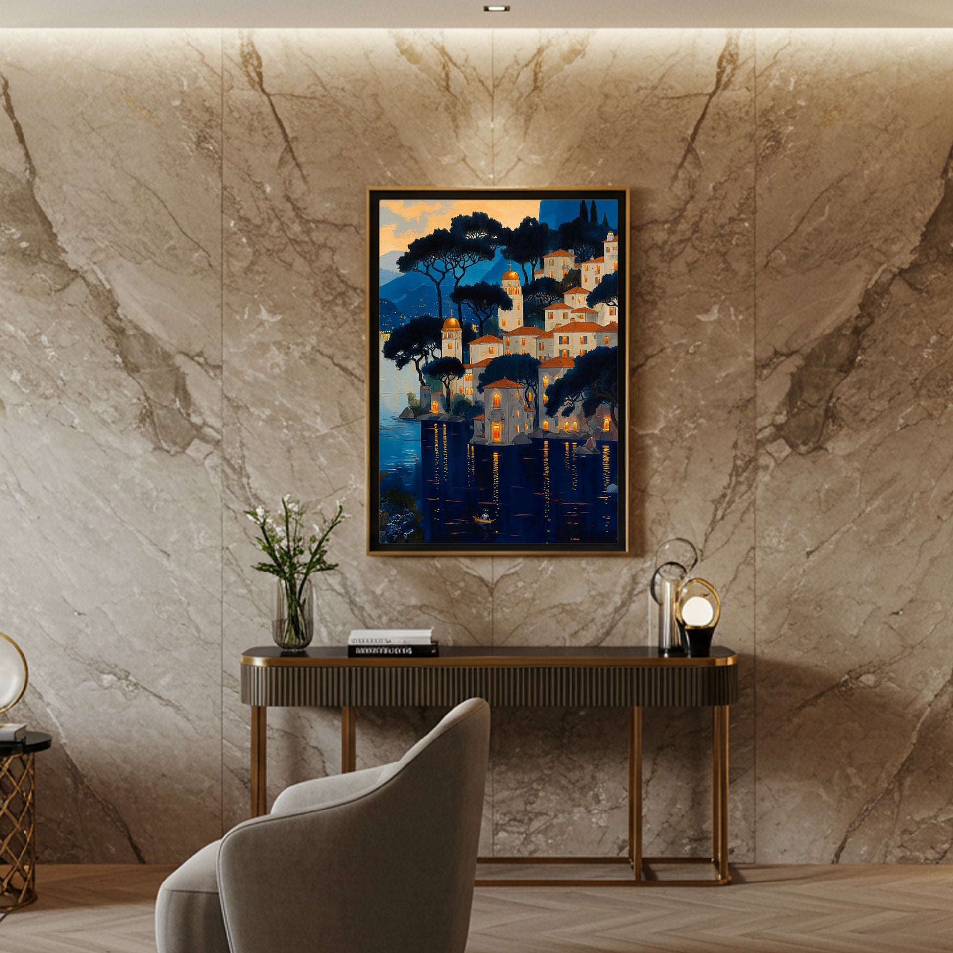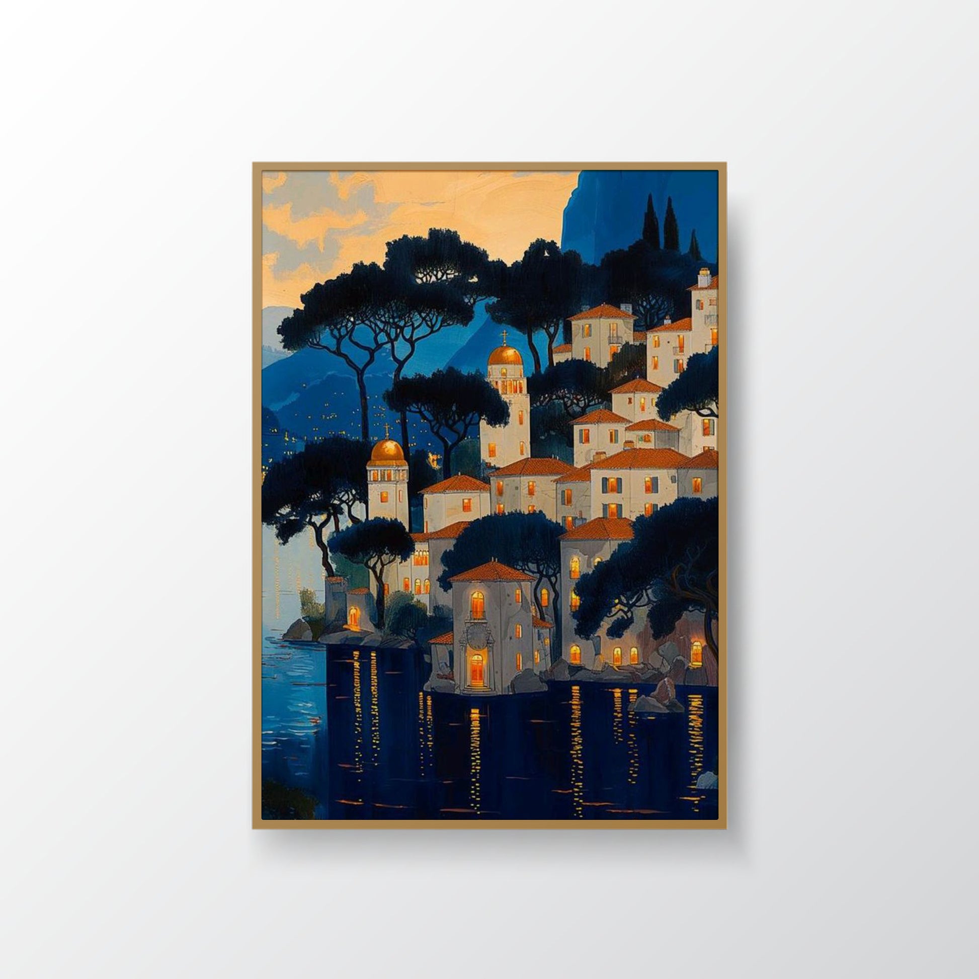 Nestled along a tranquil shoreline, Twilight Haven captures the serene charm of a coastal village as dusk embraces the sky. Golden lights flicker through quiet homes, reflecting softly on the still waters — a perfect harmony between warmth and nightfall. This artwork evokes the comforting feeling of returning home, where peace and beauty quietly coexist