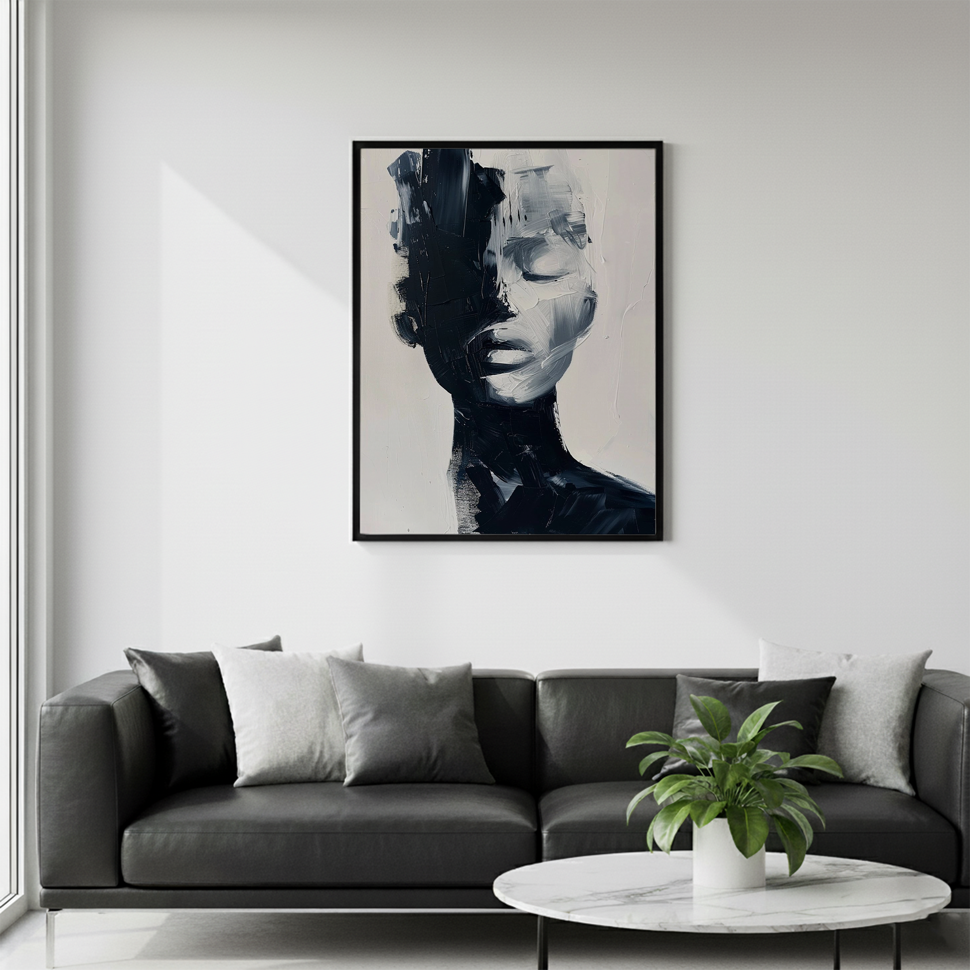 An expressive black and white portrait that blends bold, textured brushstrokes with delicate facial details. The figure’s closed eyes and split tones between darkness and light evoke a deep sense of calm, introspection, and emotional duality. This piece captures the tension between vulnerability and strength, making it a striking statement in any modern space.